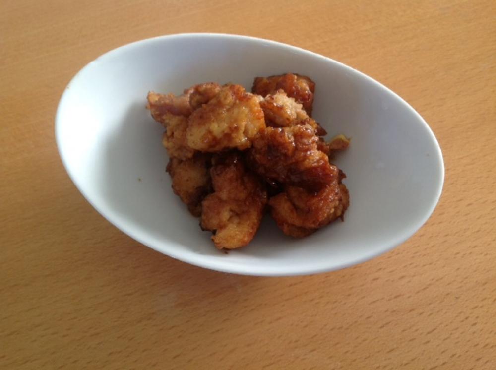 揚げた鶏肉をからめ、刻んだニンニクと混ぜ合わせたら出来上がりです。 |
