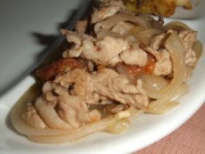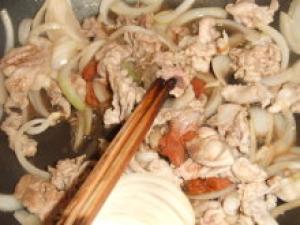 ![]() フライパンに油を熱し、豚肉と玉ねぎを炒め、★印とちぎった梅干しを加える。