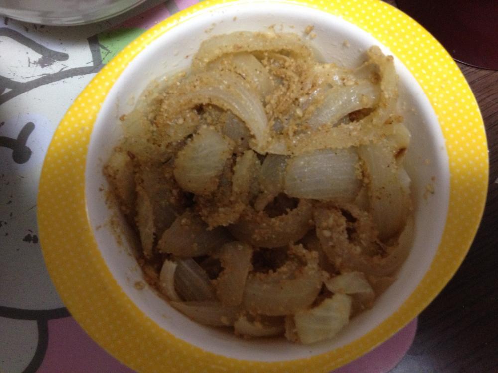 柔らかくなったタマネギにごま油と醤油を絡めて、すりごまを和えれば出来上がり。