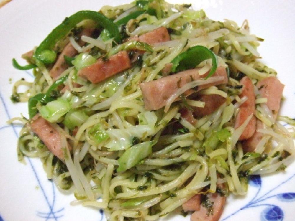 あおさは水でサッと戻し、細かく切る。キャベツは大きめ千切り、ピーマンは細切り、スパムは食べやすい大きさに切る。
