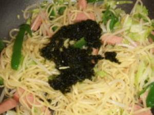 ![]() 麺と大さじ1の水を加え、ほぐしながら炒める。あおさを入れて、そばに添付の調味料を加えてよく混ぜる。