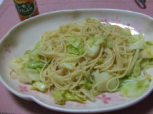 パスタを茹でる。同時にフライパンに油を熱し、生姜を炒め、香りが出たらキャベツを加え、さらに炒める。