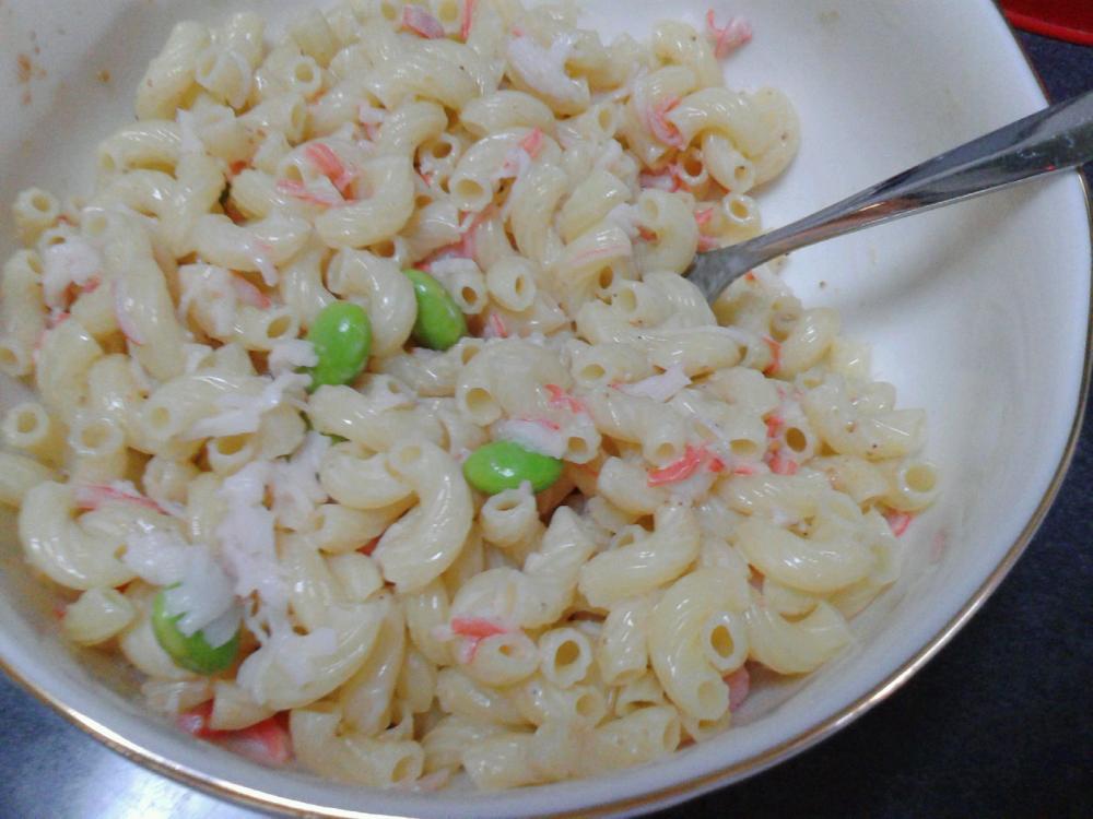 胡麻ドレッシングをかけて和えます。 粗熱が取れたら、カニカマを加えます。 |