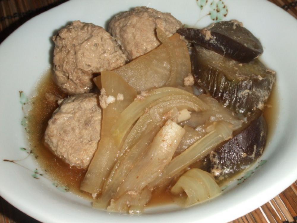 大根は皮をむいて、半月切りにし、米のとぎ汁で下ゆでする。玉ねぎは薄切り、茄子は輪切りで水にさらす。