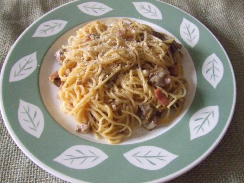 パスタを茹で、舞茸・ベーコンを食べやすい大きさに切って、熱したフライパンにオリーブオイルを入れ、ベーコン・舞茸を炒める。