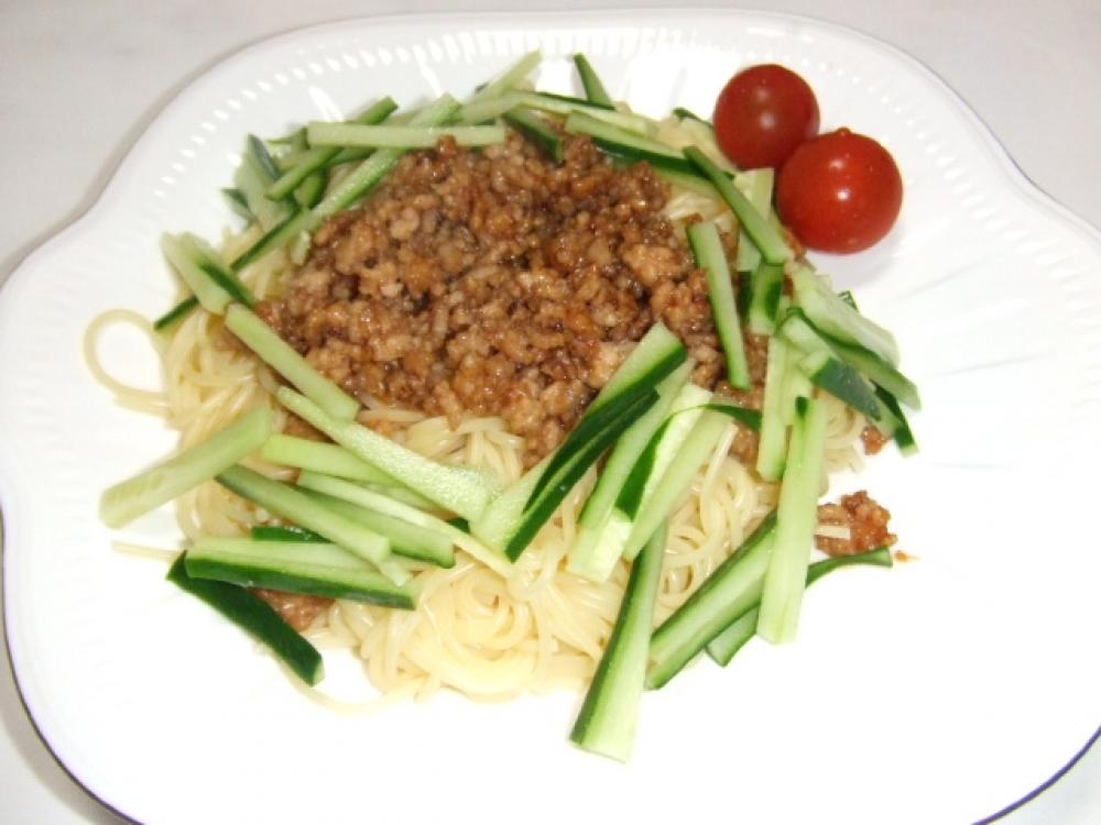 パスタを器に盛り、上から(2.)をかけ、お好みでキュウリ・トマトなどをトッピングする。