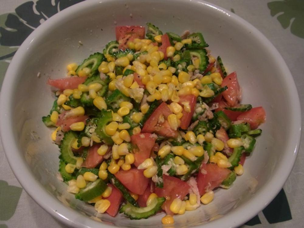 ![]() 1)のゴーヤの水気を絞り、オクラ・トマト・ツナ(軽く油分を切る)・コーンと器に盛り付け、ペッパー少々で、出来上がり~♪