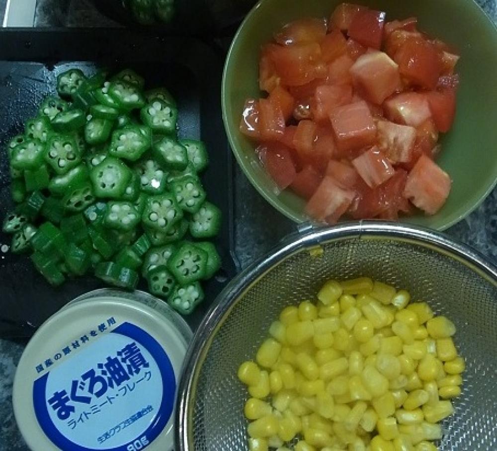 ![]() オクラはさっと茹でて、1~2mm位の厚さに、トマトは1cm角に切っておく。コーンは冷凍なら熱湯をかける。生なら茹でる。
