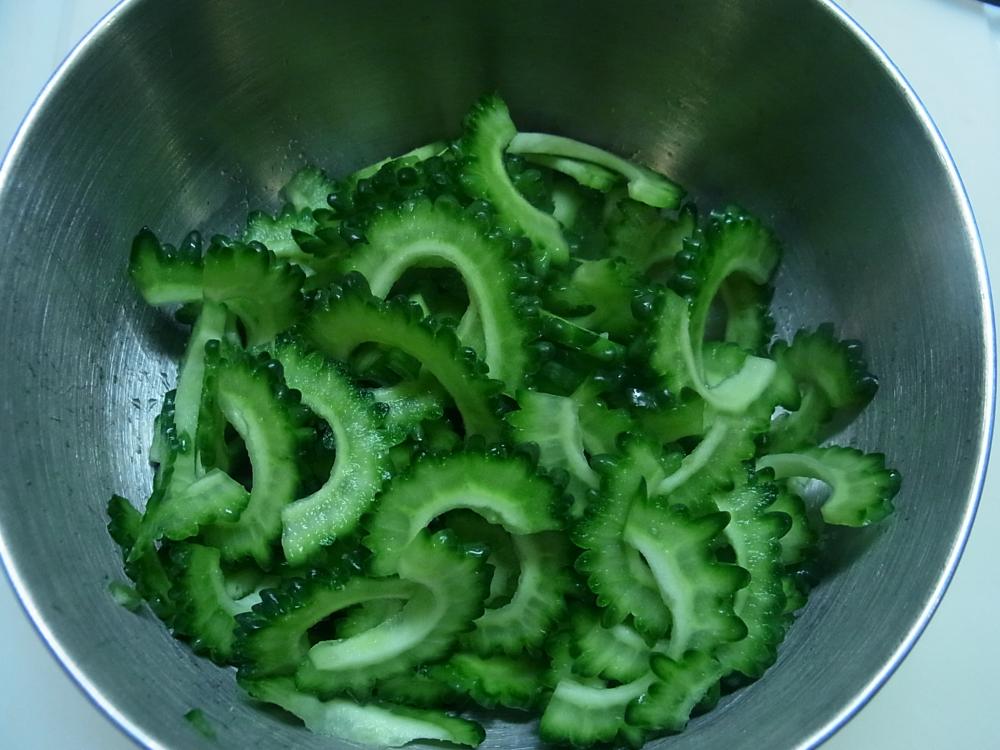 ![]() 1)ゴーヤは半分に切ってワタを取り、薄切りにし、塩をしておく。