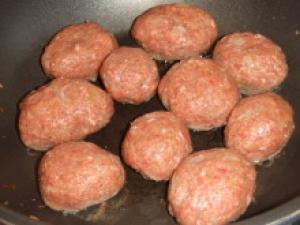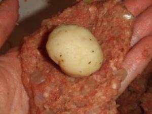 玉ねぎをみじん切りにし、透き通るまで炒め、冷まして、ひき肉・パン粉・卵・牛乳・塩・胡椒・ナツメグとセージを入れ、混ぜる。
