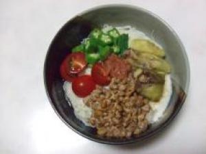 オクラはさっとゆでて、1口大に切り、トマトも半分に切る。