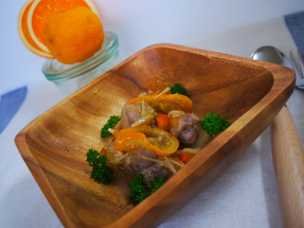すきやきのたれとオレンジ果汁少々を沸騰させて、鶏とキノコを戻してからめる。