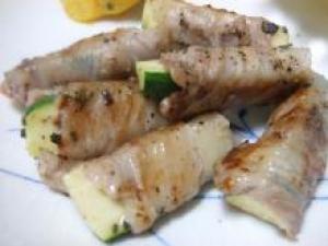 ズッキーニを縦に6等分して、豚肉で巻く。