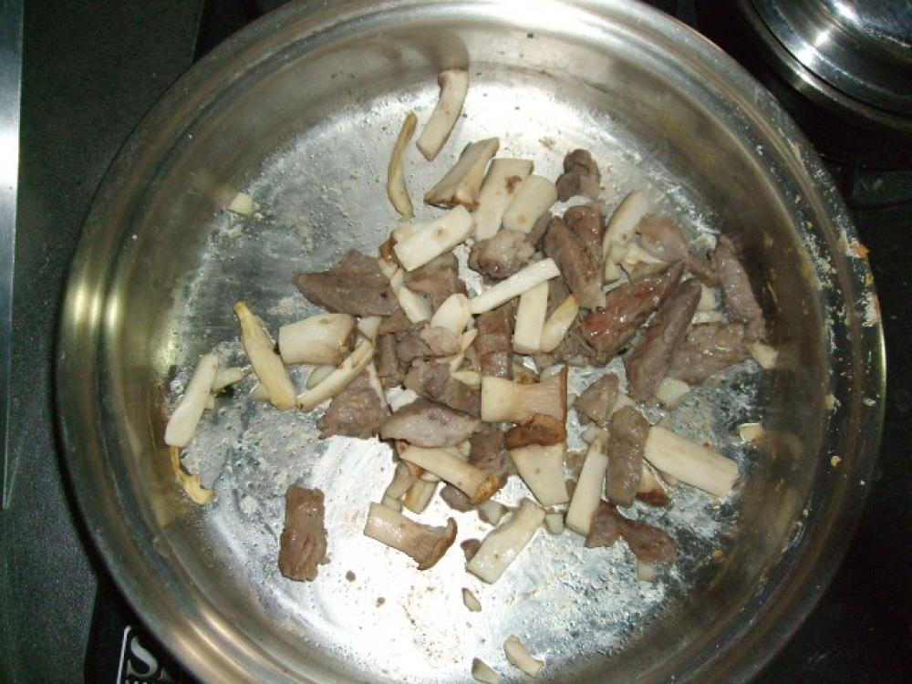 ![]() 油を引き直し、イベリコ豚とニンニク→エリンギを炒めます