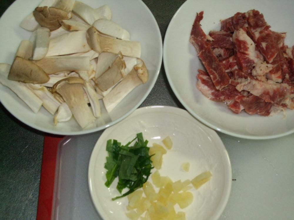 ![]() イベリコ豚は、幅1cm長さ3cmで切り塩コショウし、エリンギも同様に切ります
