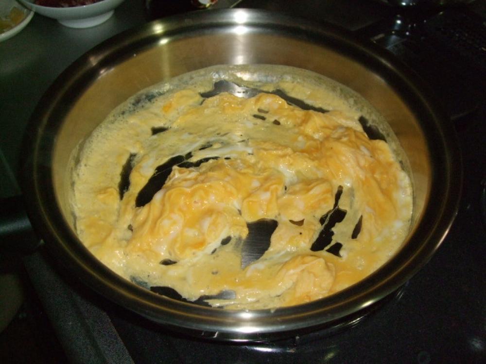 ![]() 卵とAを混ぜ、フライパンを熱して油を引き、卵液を流し入れふわふわの半熟卵にします。7割程焼けたら取り出します