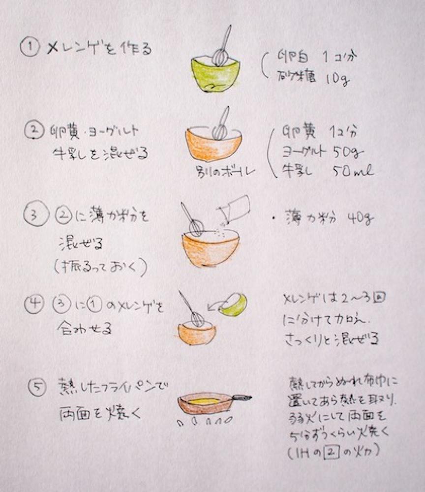 ![]() フライパンをしっかり熱した後、ぬれ布巾に乗せてあら熱を取り、(4)の生地を流し入れ、弱火で両面を5分くらいずつ焼きます