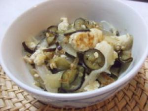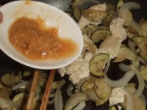 ★印を合わせておく。フライパンにごま油を熱し、玉ねぎ・ナス・豆腐の順に入れて、炒める。