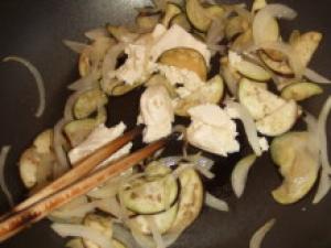 ![]() ナスは半分に切り薄切りにして水にさらし、玉ねぎは薄切りにする。
