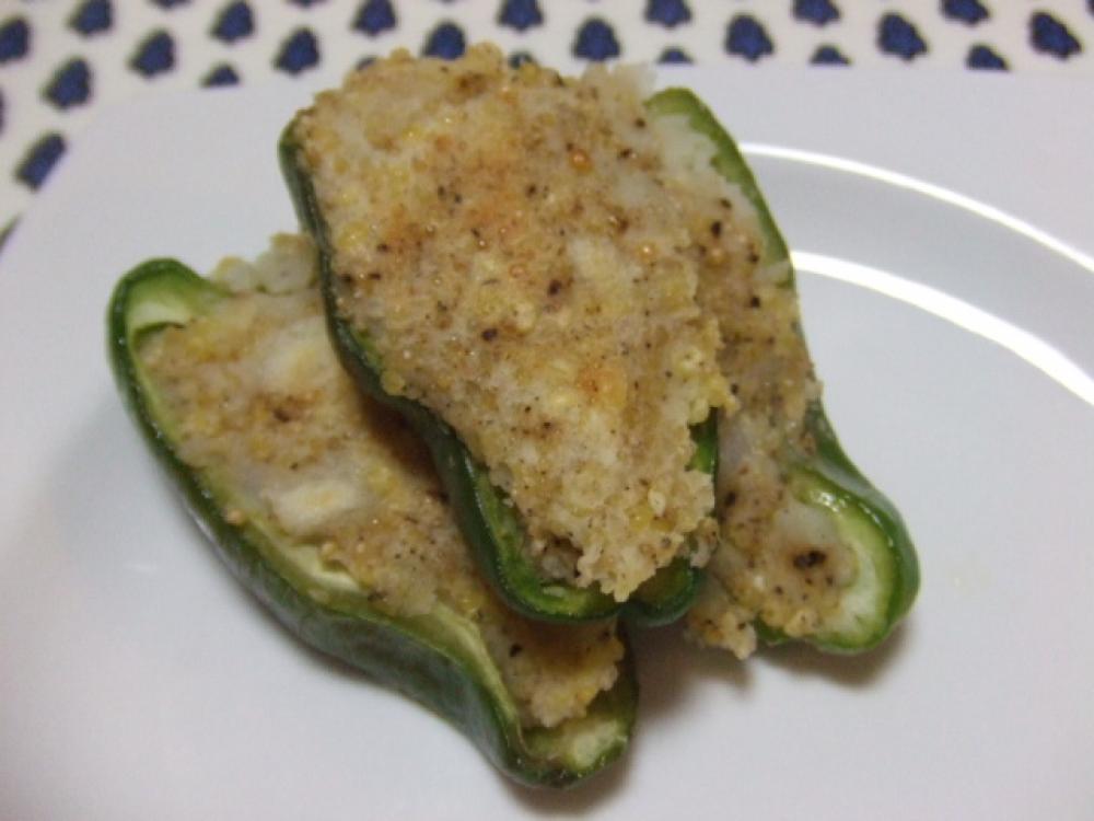 ピーマンを縦半分に切り、種を取ってから小麦粉をまぶし、(2.)を詰める。