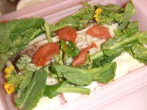 ![]() ルクエに昆布を敷き鯛と豆腐を入れ、レンコン・菜の花を散らす。ちぎった梅干しを乗せ昆布茶と酒をかける。全体に長芋をかける。