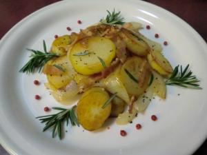 6に5を戻し入れ、ちぎったローズマリーも入れて炒め合わせ、塩、コショウで調味します。