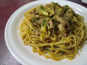 フライパンにサラダ油を熱し、1を入れて炒め、中華麺を加えてから、水を加えてほぐしながら炒めます。