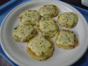 4を5mmくらいの厚さにつぶして、ゴマ油(分量外)を熱したフライパンで両面カリッとして、キツネ色になるまで焼きます。