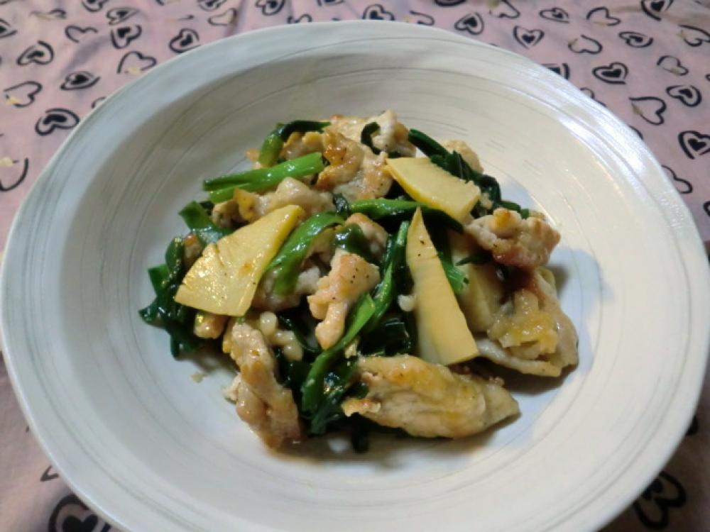 フライパンにサラダ油を熱し、1の豚肉を広げるように入れて炒めます。肉の色が変わってきたら、タケノコを加えて炒めます。