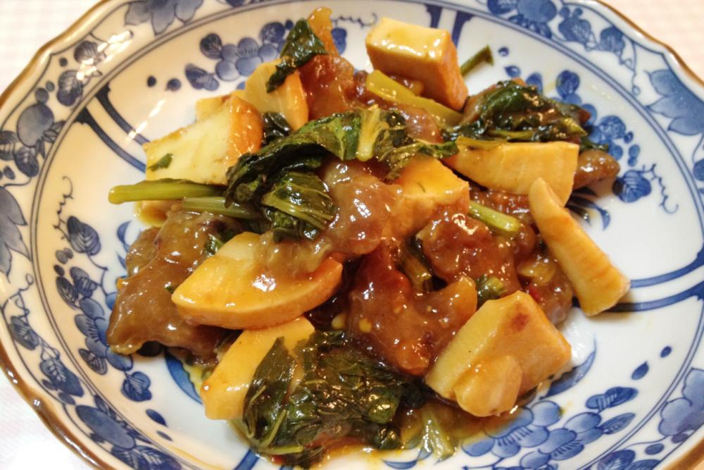 油を引いた中華なべで竹の子と小松菜(芯)を炒めます。