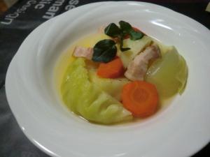 鍋に水、ローリエ、コンソメと1のベーコン、野菜、ニンニクを入れて火にかけ、煮立ったらアクを取りながら15~20分位煮ます