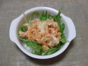 ☆印の材料をよく混ぜ、(2.)と和える。器に水菜を敷いて上から海老マヨをかける。