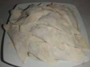 ![]() ワンタンの皮に(2.)を少し乗せ、ふちに水をつけて包む。