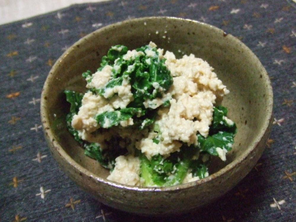 レンジで2~3分水切りした豆腐・練りゴマ・味噌・昆布茶をよく混ぜ合わせ、(1.)と和える。