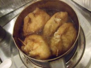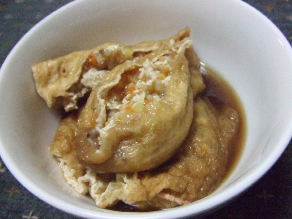 油揚げを半分に切り、お湯をかけて油切りしてから袋状に開き、(2.)と銀杏を入れ、つまようじで閉じる。