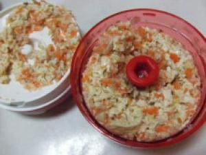 ![]() にんじん・生姜・しいたけ・長芋は皮をむいて、適当な大きさに切り、スピーディーチョッパーでみじん切りにする。