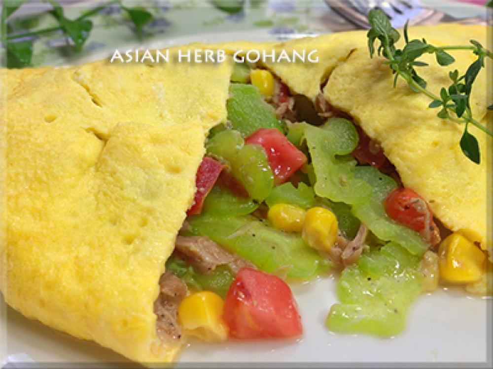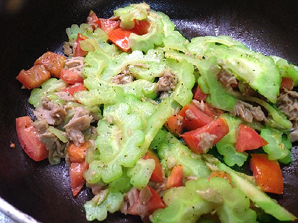 ![]() フライパンにバター少々を入れゴーヤを炒め、コーンとトマトも入れさっと一混ぜしたらツナも入れて塩、黒胡椒で濃い目に調味しま