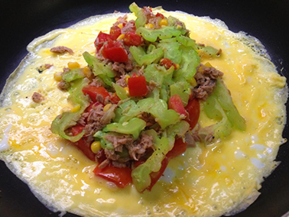 ゴーヤは薄切り塩でもみ水洗いし水気を絞り、トマト2cmの角切り、ツナは軽く水気を絞る。卵牛乳ゴーヤ塩コショウを合せる。