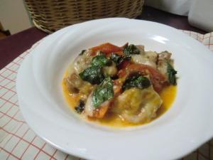 チーズが溶けてきたら、火から下ろし、バジルをちぎって散らします。