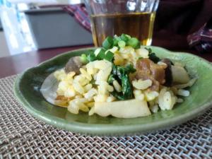 ご飯に溶いた卵をまんべんなく混ぜておきます。