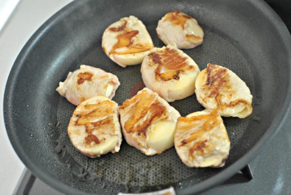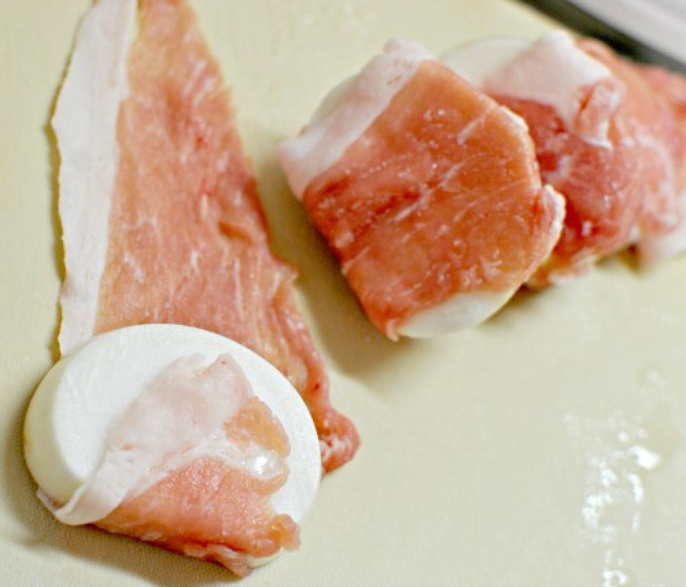 ![]() かぶは4等分に切り、豚肉を巻き、軽くぎゅっと握って密着させる。