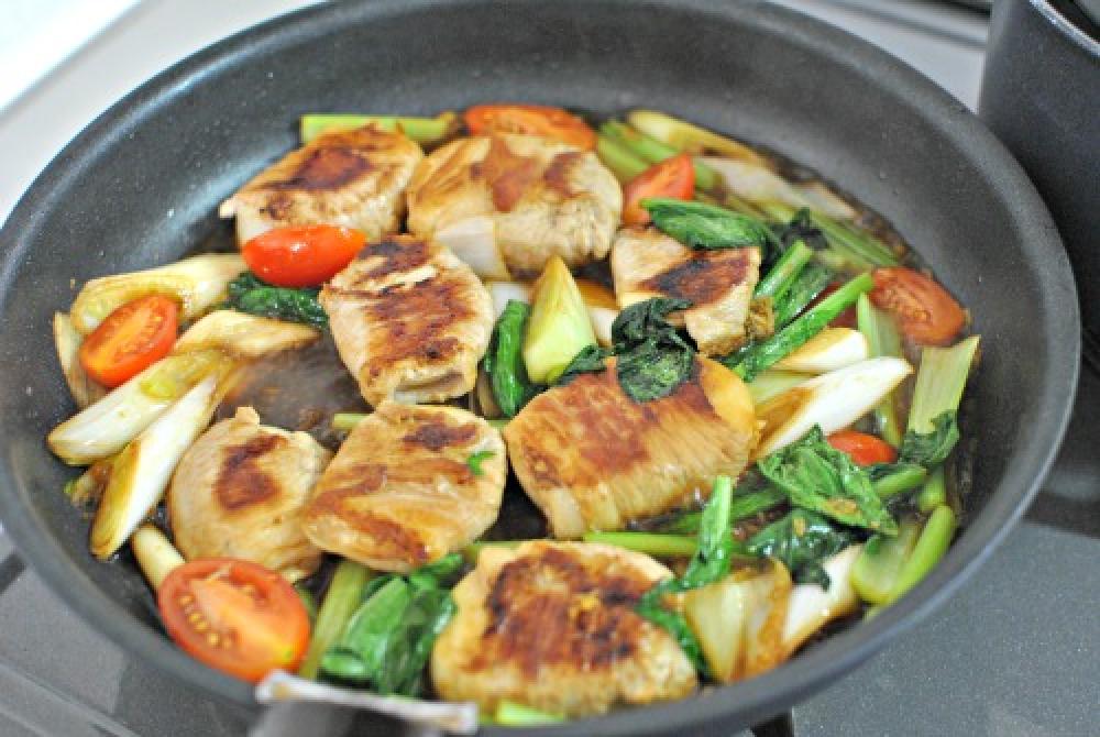 ![]() しんなりしてきたら、ミニトマト、◎を加え、全体に絡めながら1~2分煮詰める。