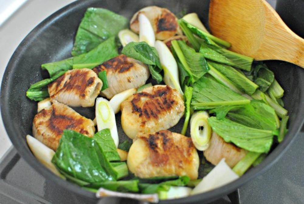 ![]() 蓋を取って中火にし、ネギ、小松菜を加えて木べらでざっくりと炒め合わせる。