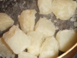 ![]() じゃがいもがやわらかくなったら、お湯を捨て、火がついたままの状態で、鍋をふりながら水分を飛ばす。