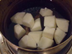 ![]() じゃがいもは皮をむいて、食べやすい大きさに切り、かぶるくらいの水と一緒に鍋に入れ、火にかける。