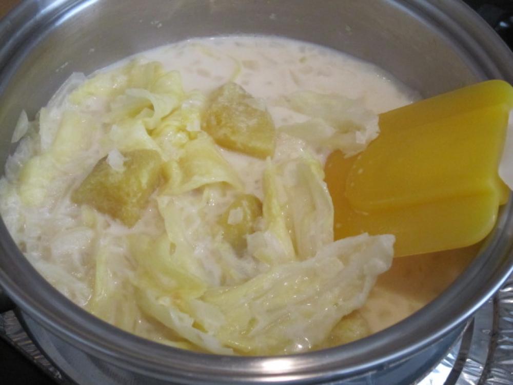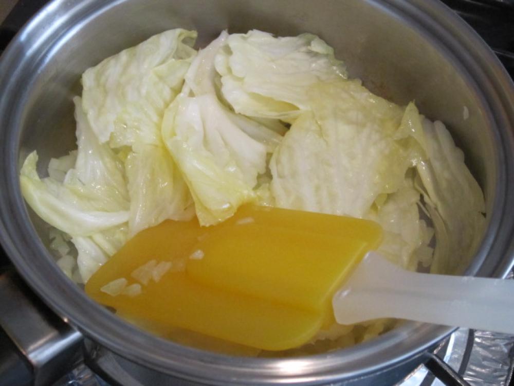 ![]() 小鍋にバターとタマネギを入れて炒め、すきとおったら、ひと口大に切ったキャベツを