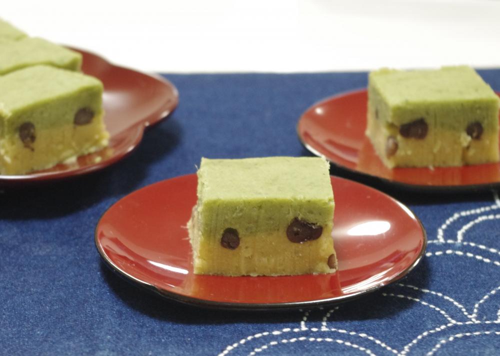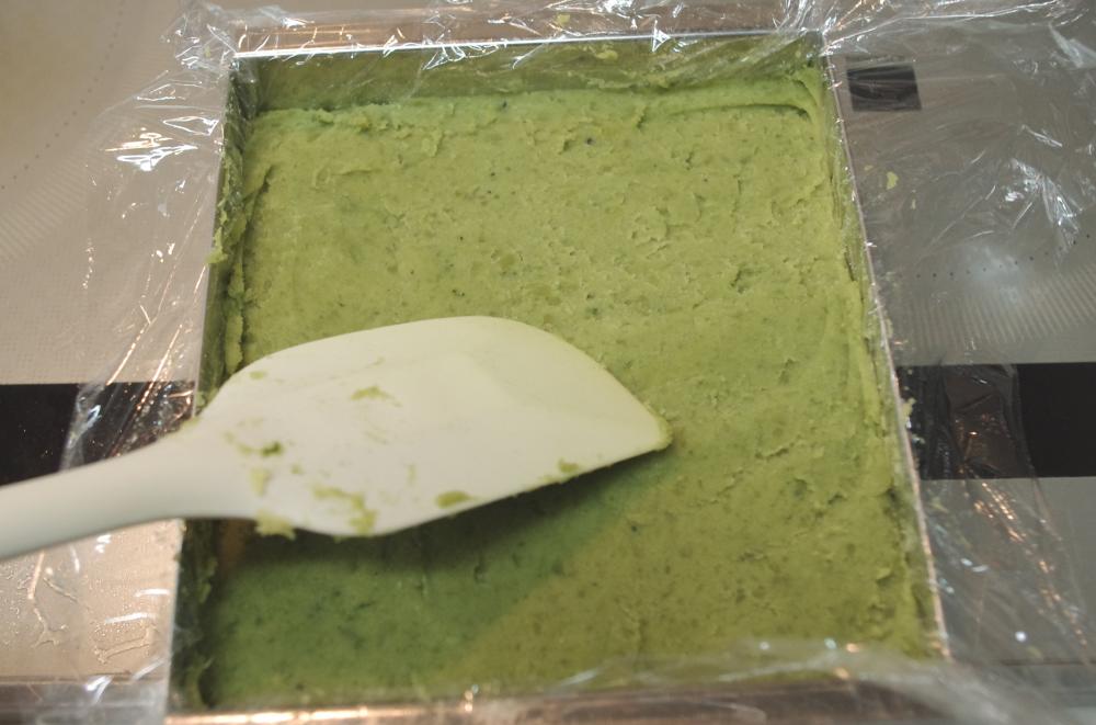 ![]() プレーンな生地の上に甘納豆を散らしてから、上に抹茶生地を入れて、平らになるように押し付ける。