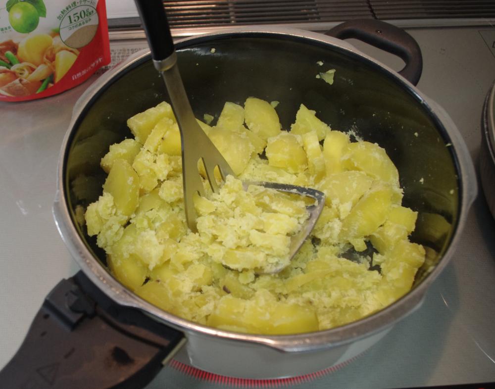 ![]() さつま芋が熱いうちに、マッシャ-を使って潰して、塩とラカントS顆粒を混ぜる。