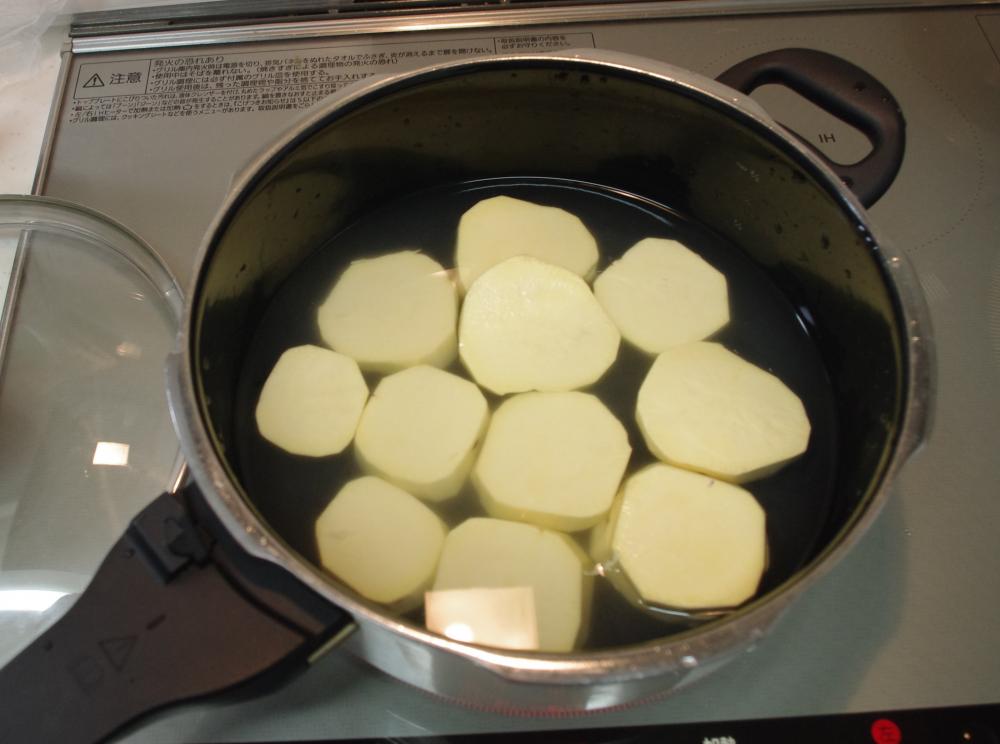 ![]() さつま芋は、皮を剥き輪切りにして、水にさらす。