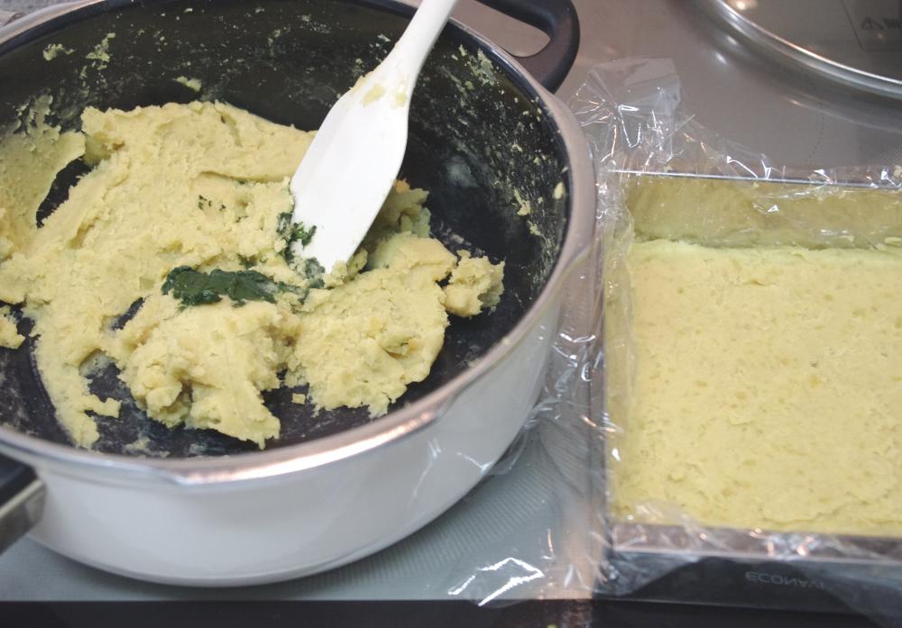 ![]() 半量を取りだし、ラップを敷いた型に敷き詰める。